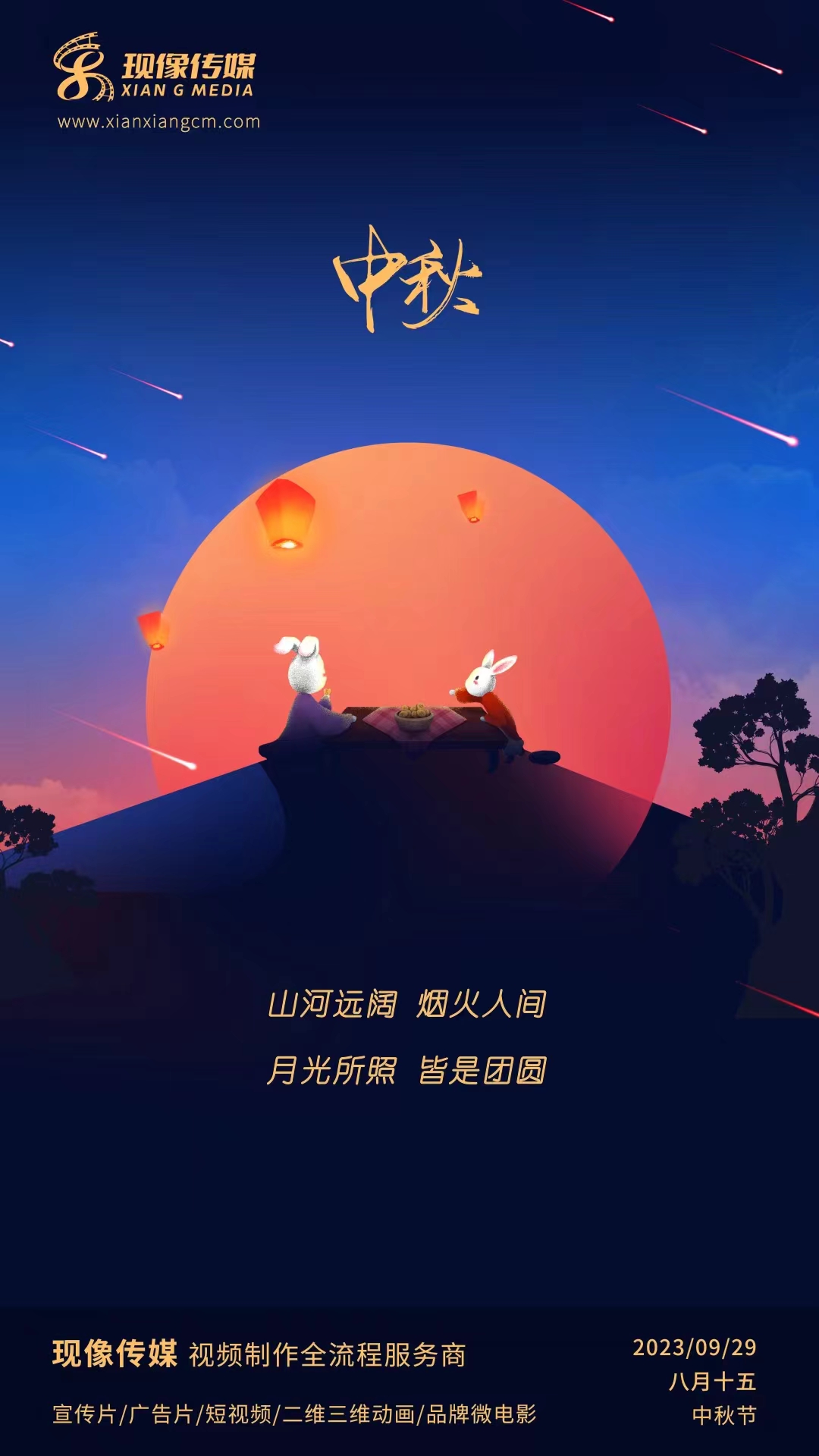 現(xiàn)像傳媒祝大家中秋節(jié)快樂 作者:admin | 時間:2024-03-06 18:43:54 山河遠闊,煙火人間 月光所照,皆是團圓 祝大家中秋節(jié)快樂! ,現(xiàn)像傳媒祝大家中秋節(jié)快樂